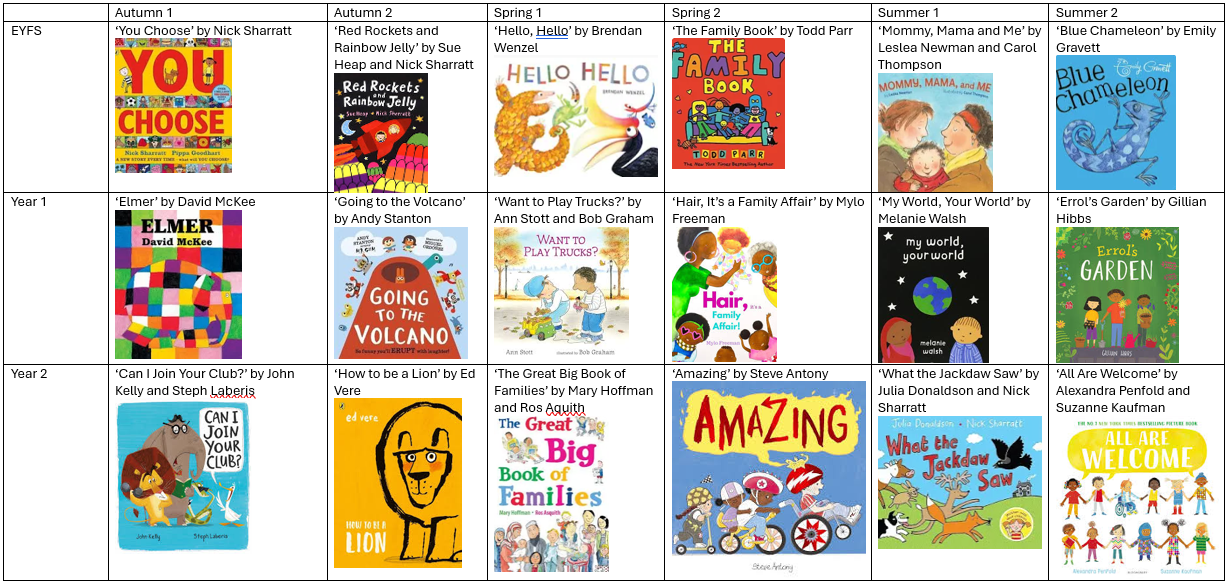 In each of our ‘No Outsiders’ lessons, children learn through a story book, all of which link to our British Values. These books are readily available in shops and online. Whilst this is an outline of the books used in each term and year group, teachers are able to use texts from different terms if the learning is appropriate and more relevant to them at that time.