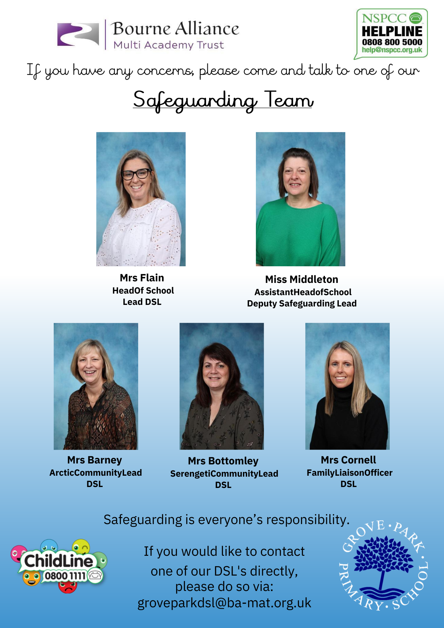 If you would like to  contact one of our DSL's directly, please do so via:   groveparkdsl@ba-mat.org.uk